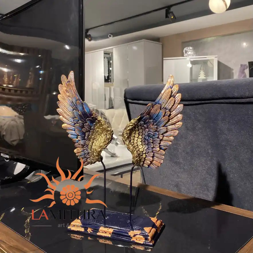 The size of the sculpture is often compact, making it suitable for display on a tabletop, shelf, or as a decorative accent in various settings. The wings are usually mounted on a sturdy base or stand, allowing them to be freestanding.